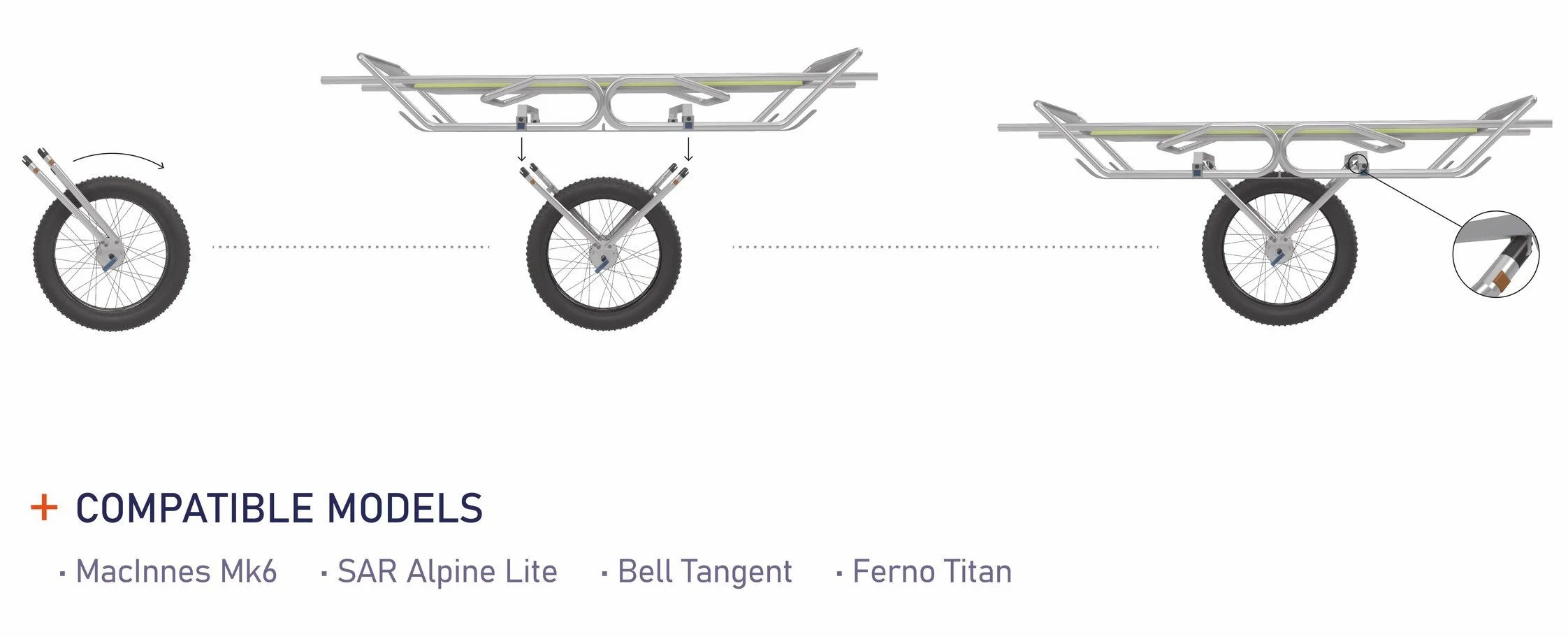 The Peak Rescue wheel unit is compatible with the four main stretcher models used in the UK, making it a versatile addition to any team’s rescue equipment. Featuring a quick-release Isofix mechanism, teams can easily attach and detach the stretcher wheel unit to any of their stretchers in seconds, without the need for any additional tools. The stretcher wheel unit has a robust frame made from high-quality aluminium 6061, making it lightweight and durable, perfect for use in mountain rescue scenarios. It also features a wide 26x4.0” bike wheel that can easily travel over all terrain, ensuring teams can descend quickly and efficiently, whether they’re dealing with rocky mountain paths or soft snow conditions.